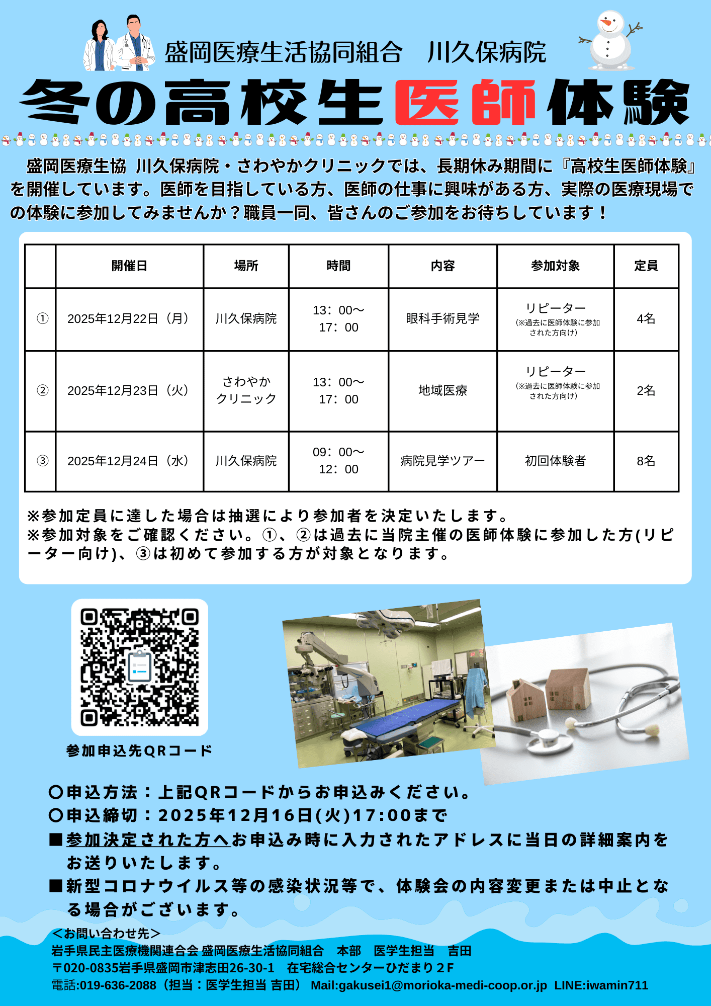 2025年12月22日(月)、12月23日(火)、12月24日(水)に医師体験会を開催いたします。参加希望の方はチラシのQRコードまたは申し込みURLより参加申し込みをしてください。